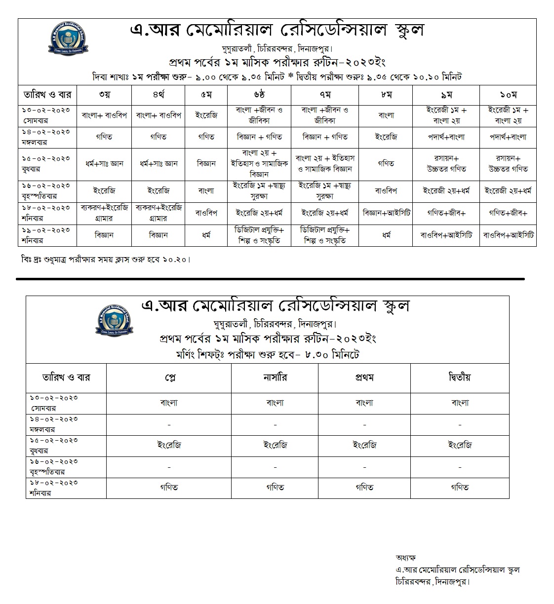 এতদ্বারা সকল শিক্ষার্থী ও শিক্ষকগণকে জানানো যাচ্ছে যে, আগামী ১৩/০২/২০২৩ইং রোজঃ মঙ্গলবার প্রথম পর্বের ১ম মাসিক পরীক্ষা অনুষ্ঠিত হবে।